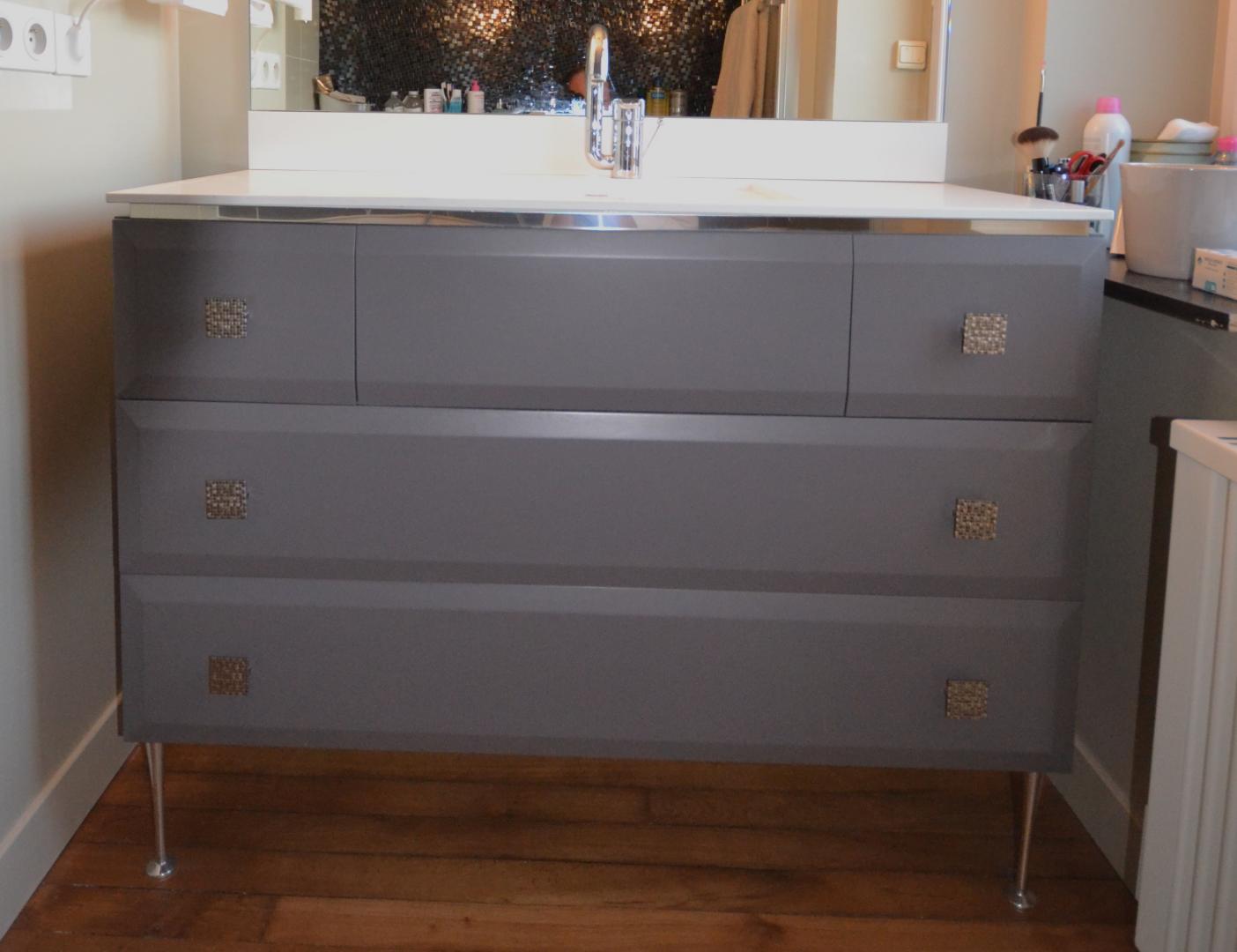 Plan de toilette en quartz monté sur éléments standards IKEA ou similaire, pour vasques à poser ou coller sous plans. Solution chic et économique. Plan quartz sur mesure selon dimensions des éléments, avec ou sans plinthe en dosseret.