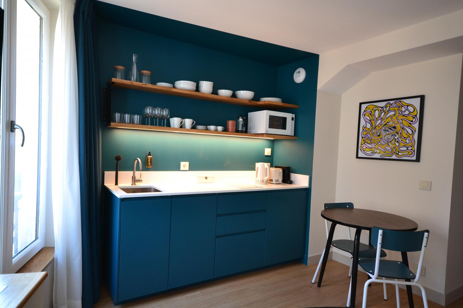Une cuisine tendance, c'est des éléments bas tous équipés de tiroirs dont on voit le contenu par le dessus lorsqu'on les ouvre : plus besoin de se baisser après avoir ouvert des portes. Les éléments hauts disparaissent. Tout reste accessible sur des tablettes qui prennent leur place, les livres de cuisines et autres stocks dans de jolies boites, le micro-onde et les appareillages sophistiqués . Plus logeable que les élements hauts, on trouve ce que dont on a besoin d'un seul coup d'oeil, sans chercher.